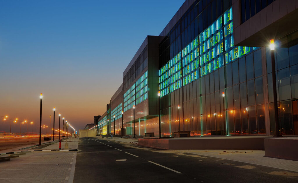 Das Gebäude 3 der Barwa Commercial Avenue hat eine 900 m Glassfassade. Jedes der Fenster lässt sich einzeln über DMX Steuern und so den in die Scheibe gedruckten arabischen Buchstaben illuminieren.