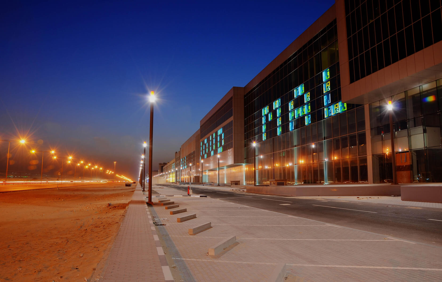 Das Gebäude 3 der Barwa Commercial Avenue hat eine 900 m Glassfassade. Jedes der Fenster lässt sich einzeln über DMX Steuern und so den in die Scheibe gedruckten arabischen Buchstaben illuminieren.